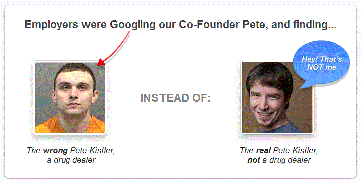 Pete Kistler, founder of BrandYourself did. It was a classic case of mistaken identity. He and a drug dealer shared the same name. Pete sought the help of his friend and SEO wizard, Patrick Ambron,